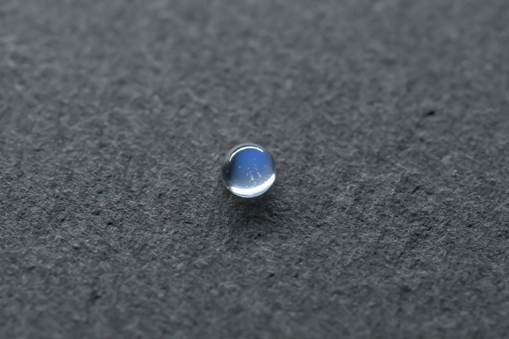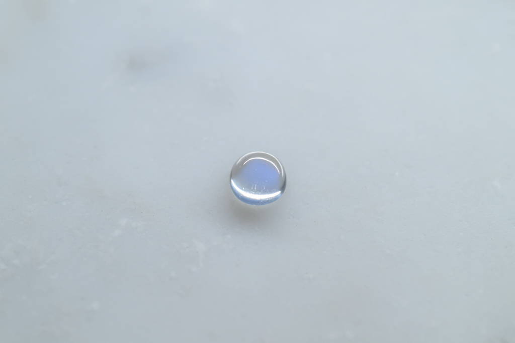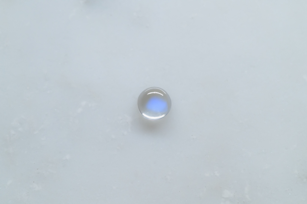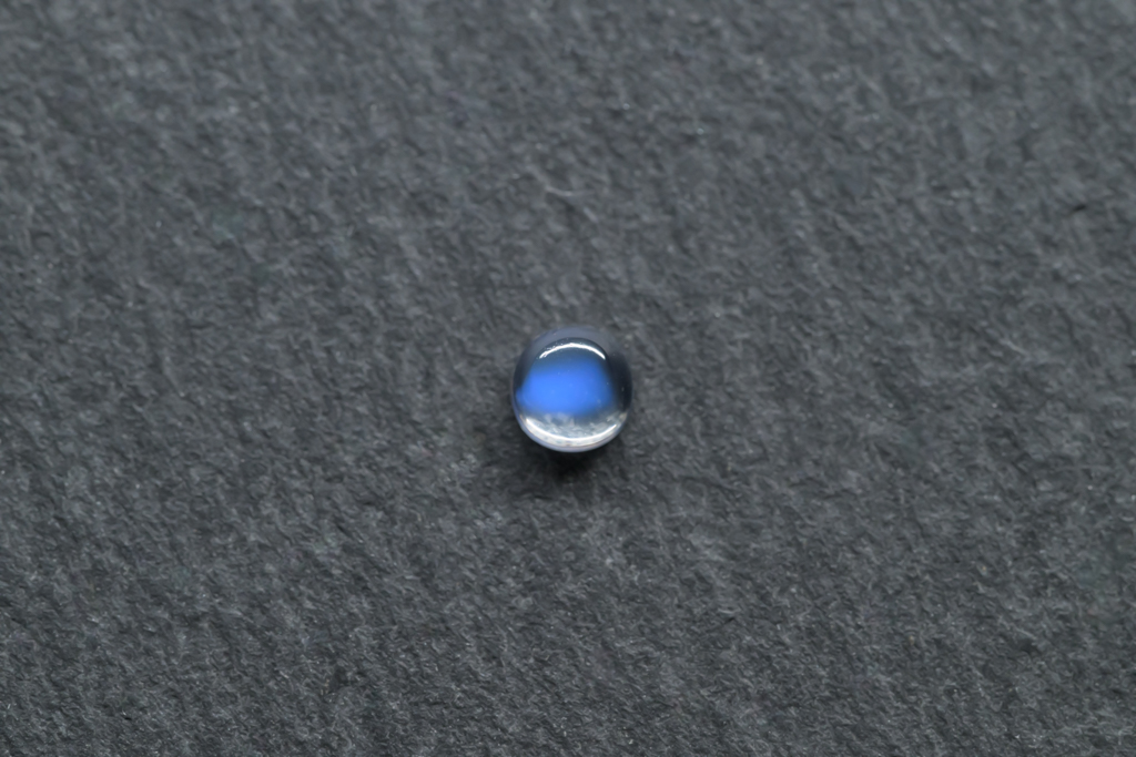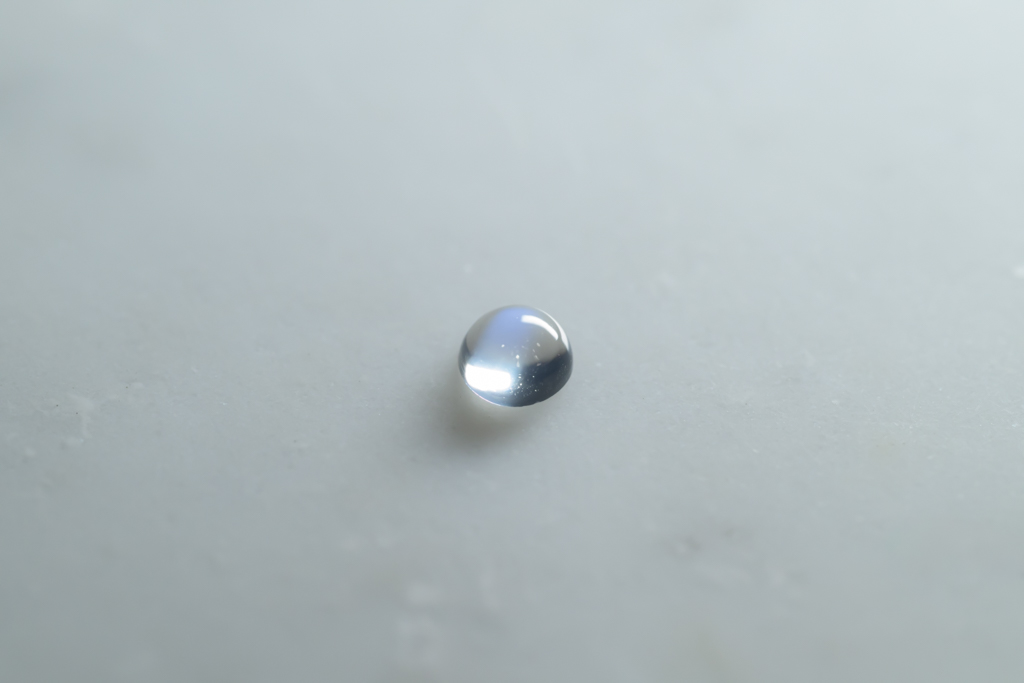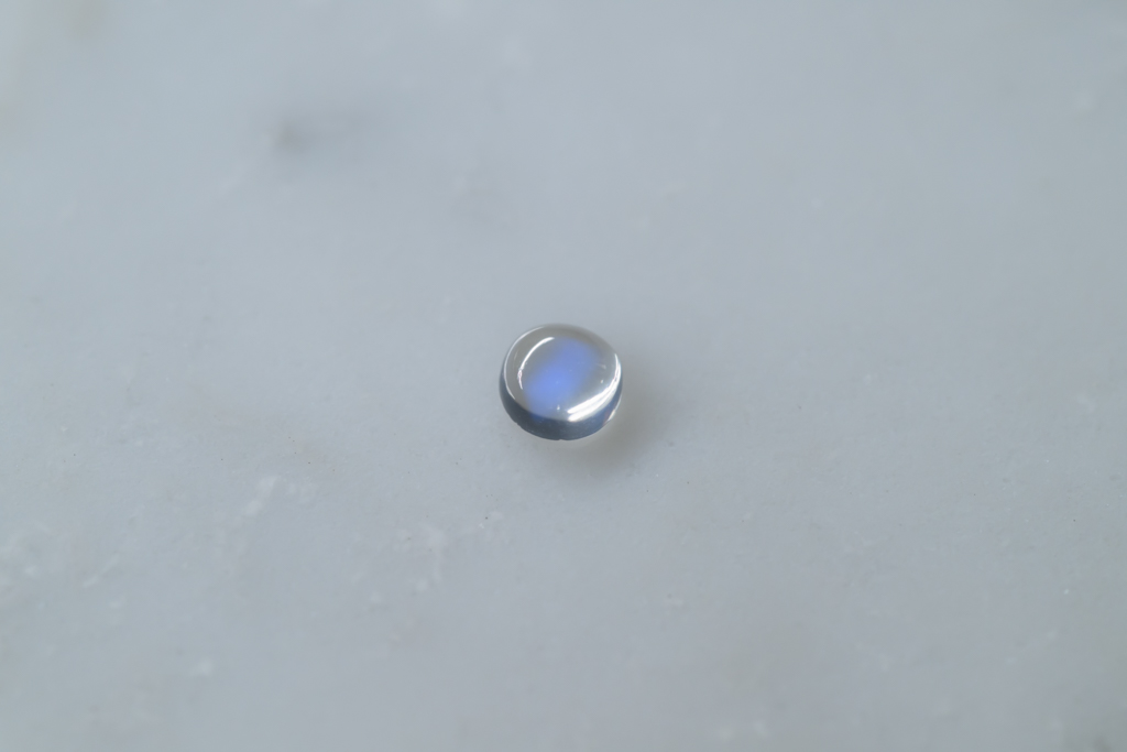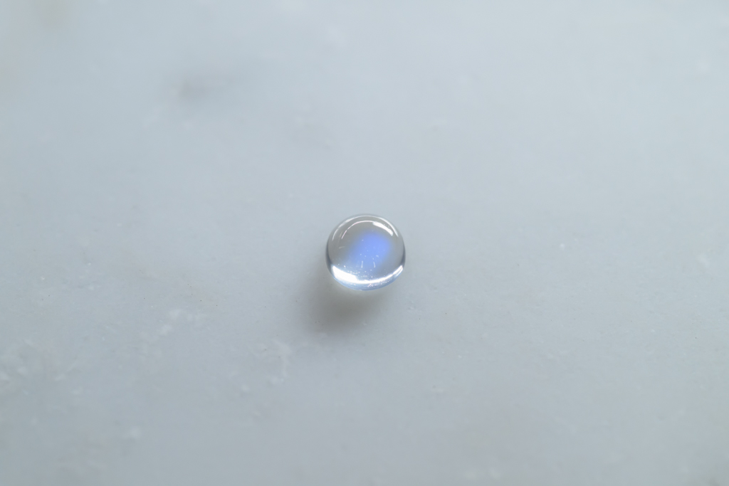 小さな水滴のような透きとおった地色が美しく、角度によって鮮やかなブルーのシラーが現れるスリランカ産のムーンストーンです。ハンドカッティングで仕上げたナチュラルな丸みが魅力的なオールドストックのルースです。