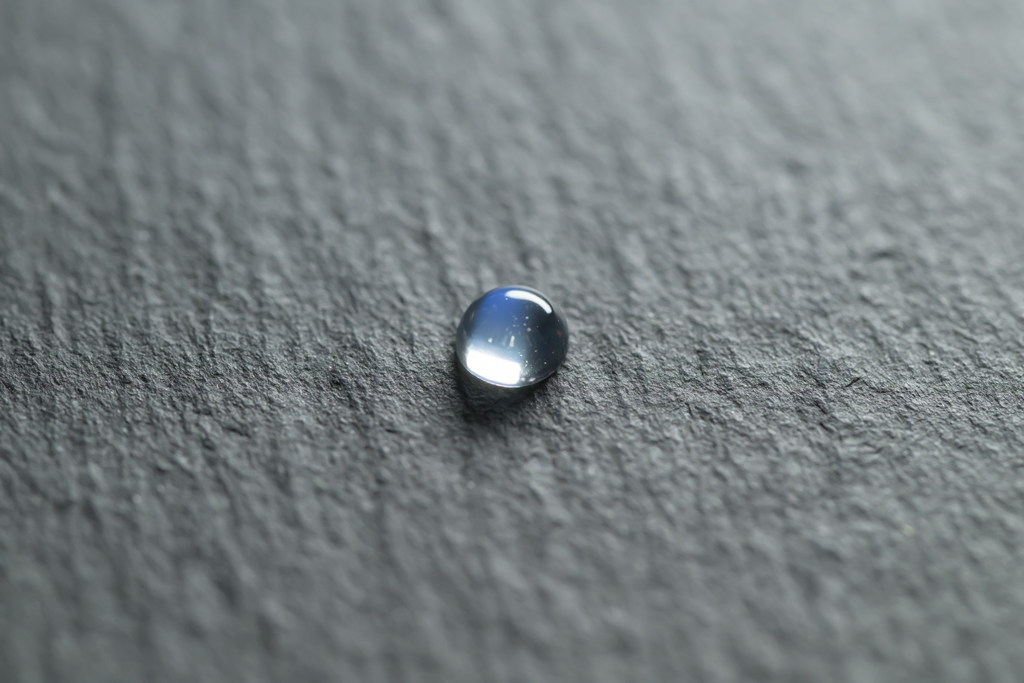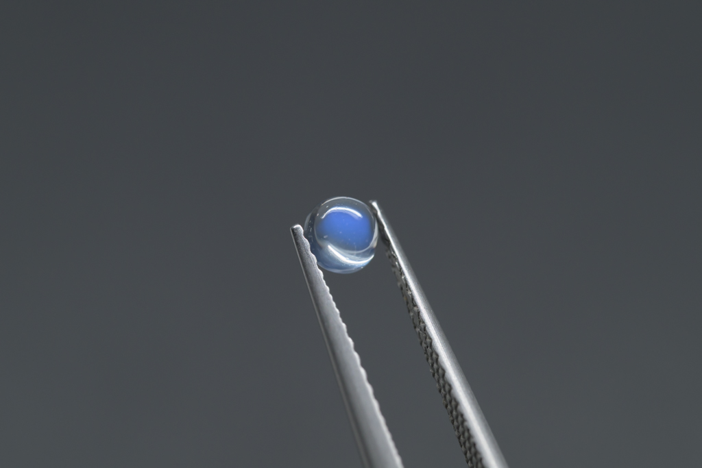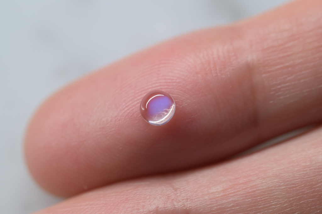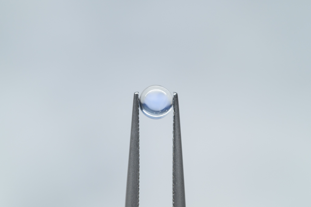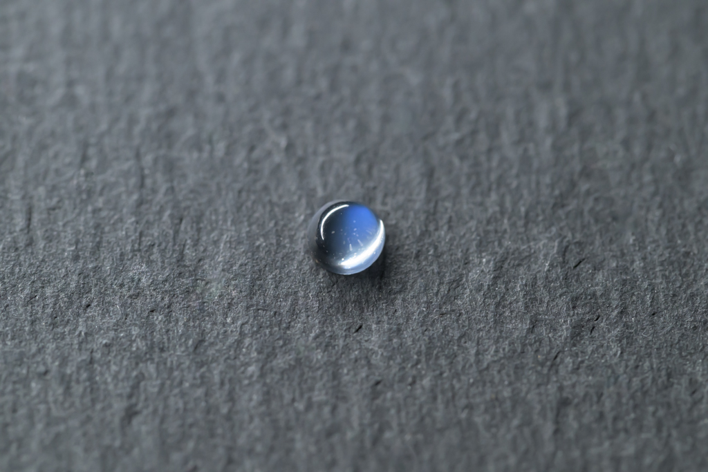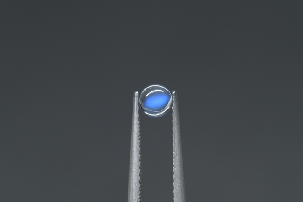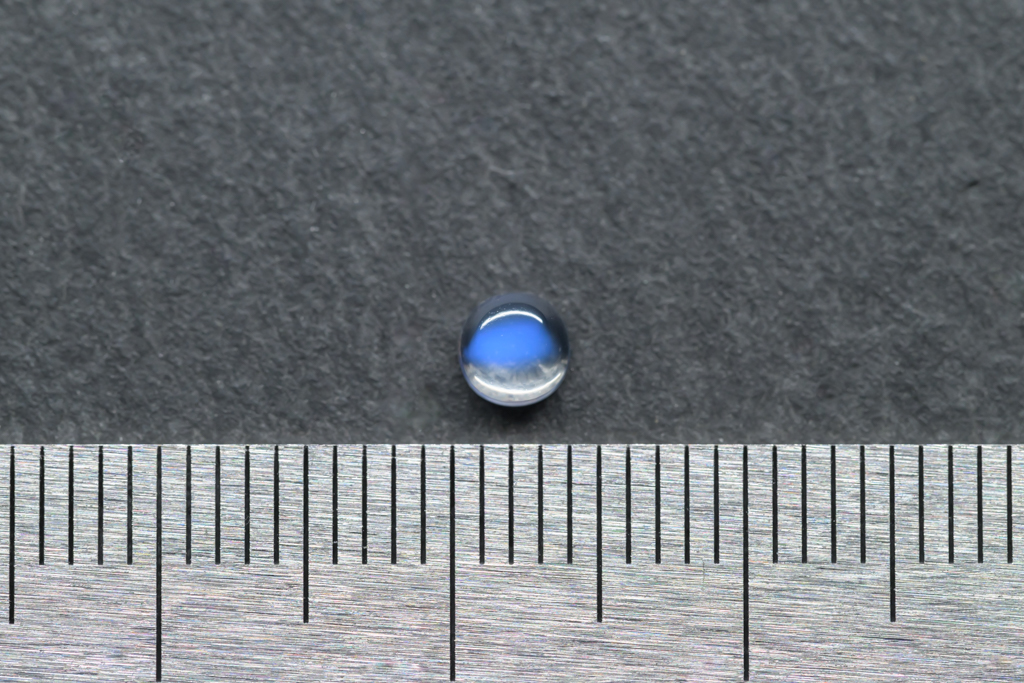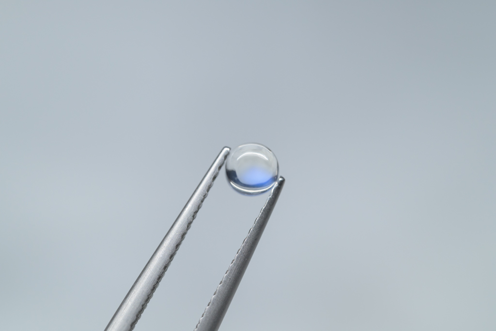 小さな水滴のような透きとおった地色が美しく、角度によって鮮やかなブルーのシラーが現れるスリランカ産のムーンストーンです。ハンドカッティングで仕上げたナチュラルな丸みが魅力的なオールドストックのルースです。