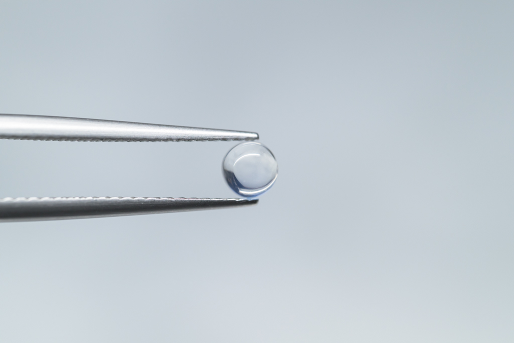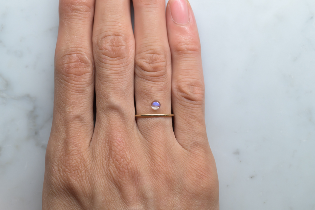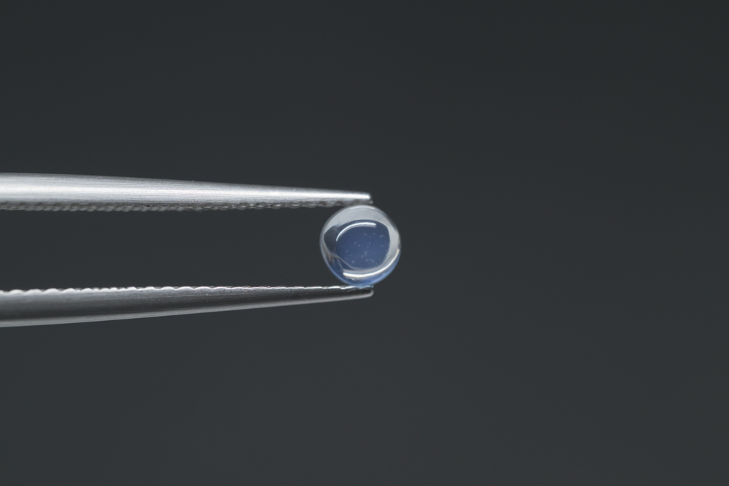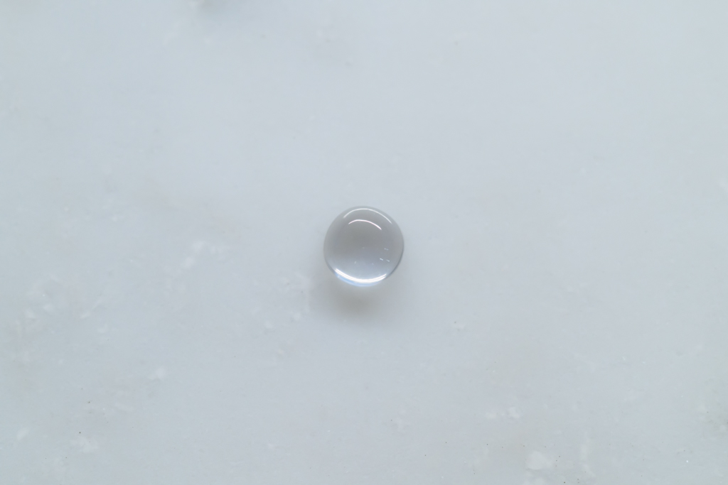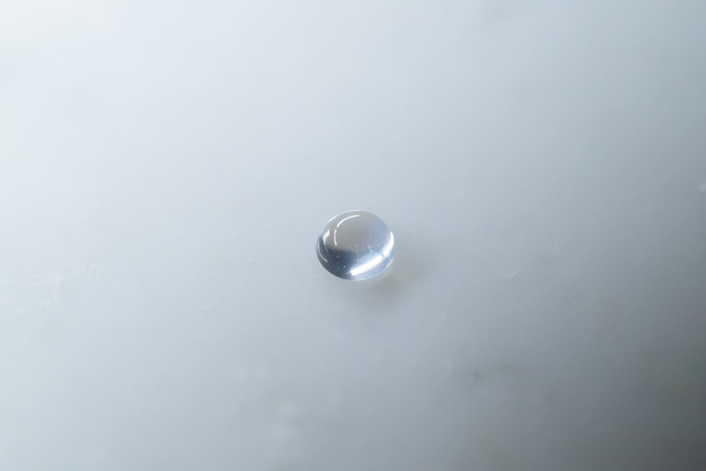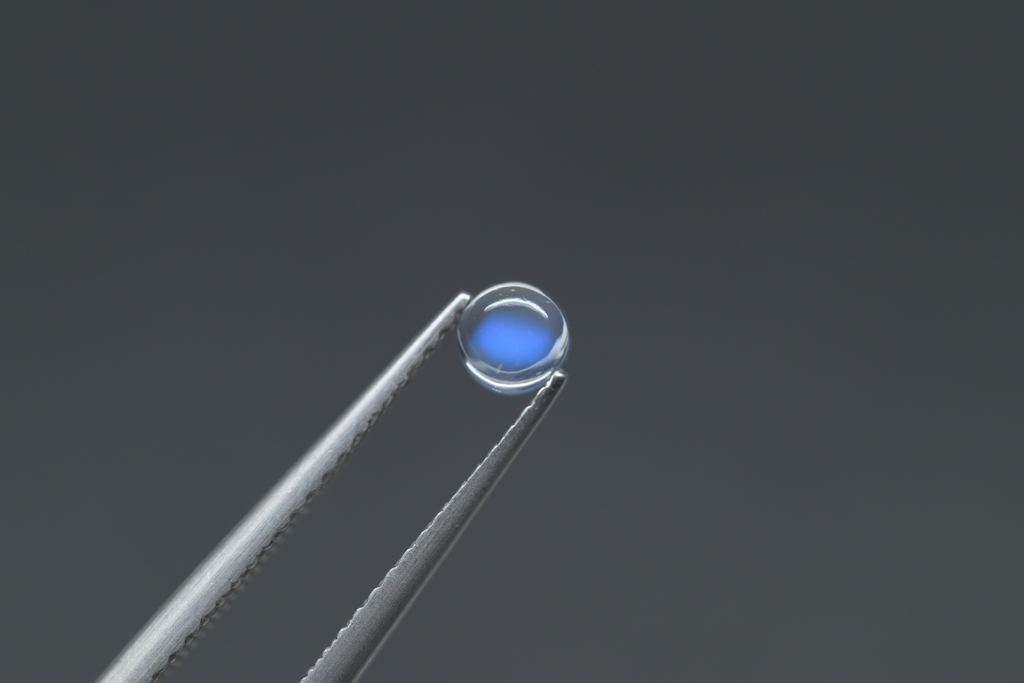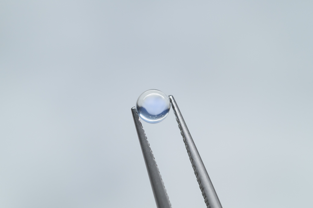 小さな水滴のような透きとおった地色が美しく、角度によって鮮やかなブルーのシラーが現れるスリランカ産のムーンストーンです。ハンドカッティングで仕上げたナチュラルな丸みが魅力的なオールドストックのルースです。