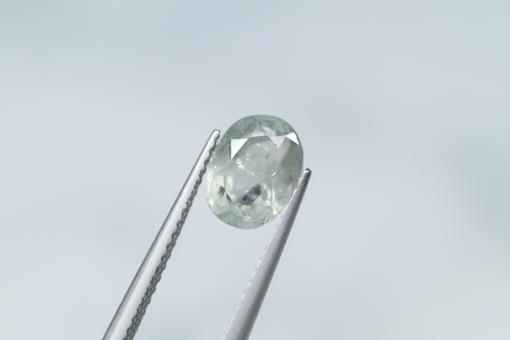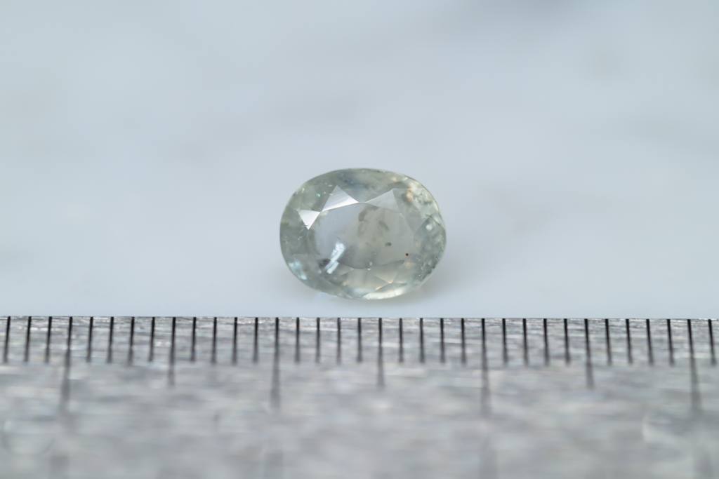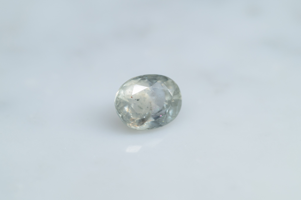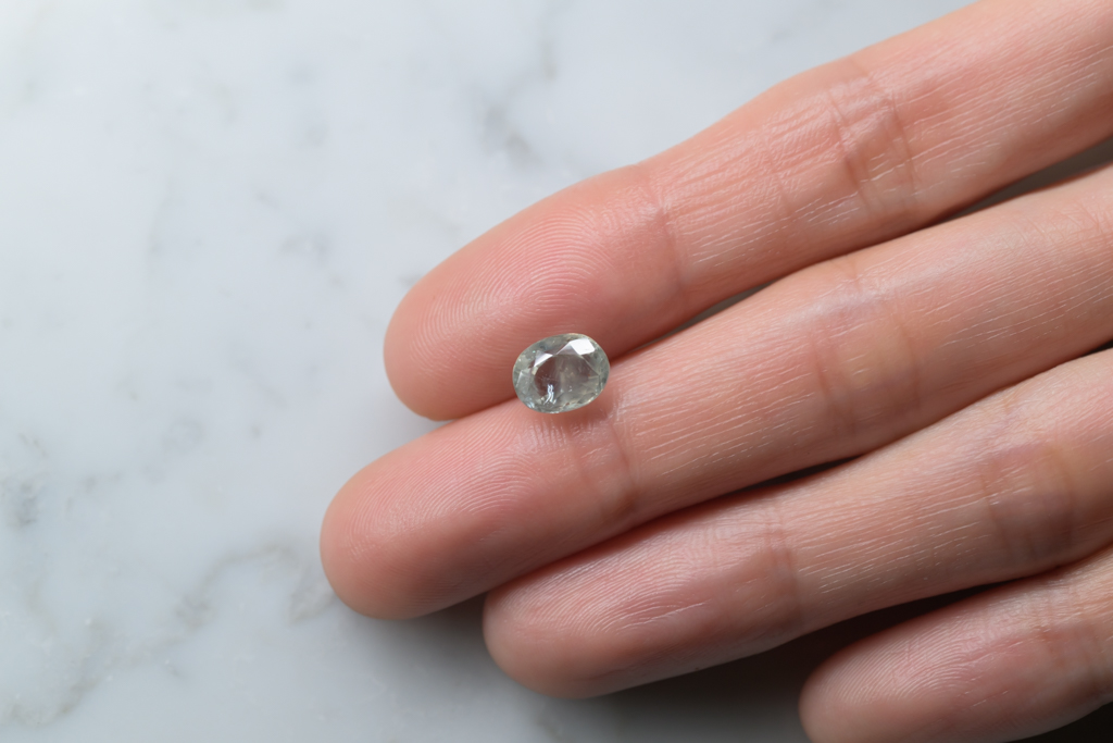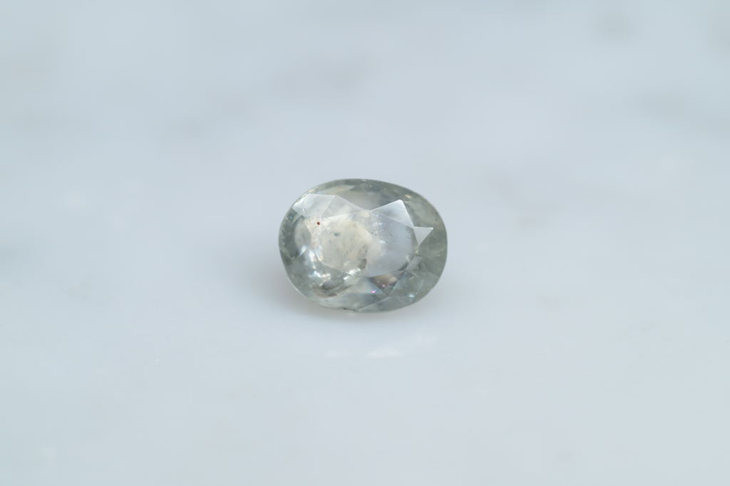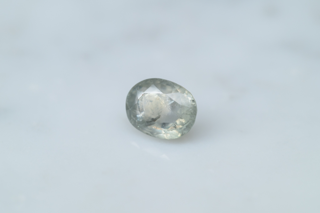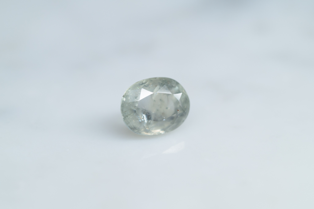 光に溶け込むような淡いグレイッシュグリーンの石の中に閉じ込められたブルーが角度によってほんのりと混ざる 繊細なニュアンスカラーが魅力的なスリランカ産のサファイアです。