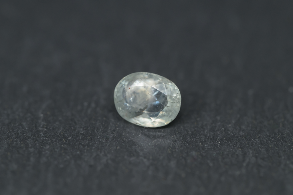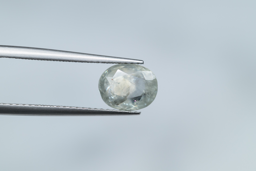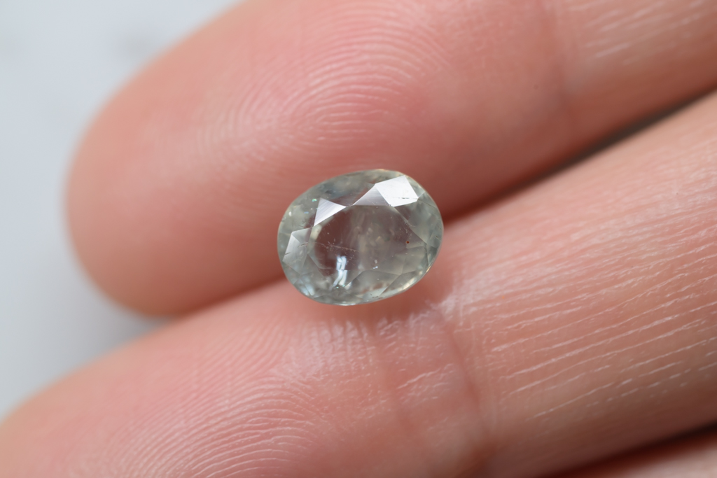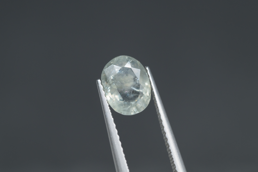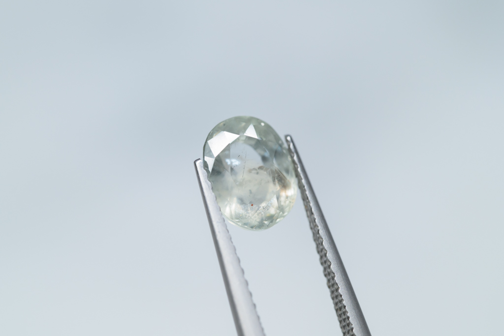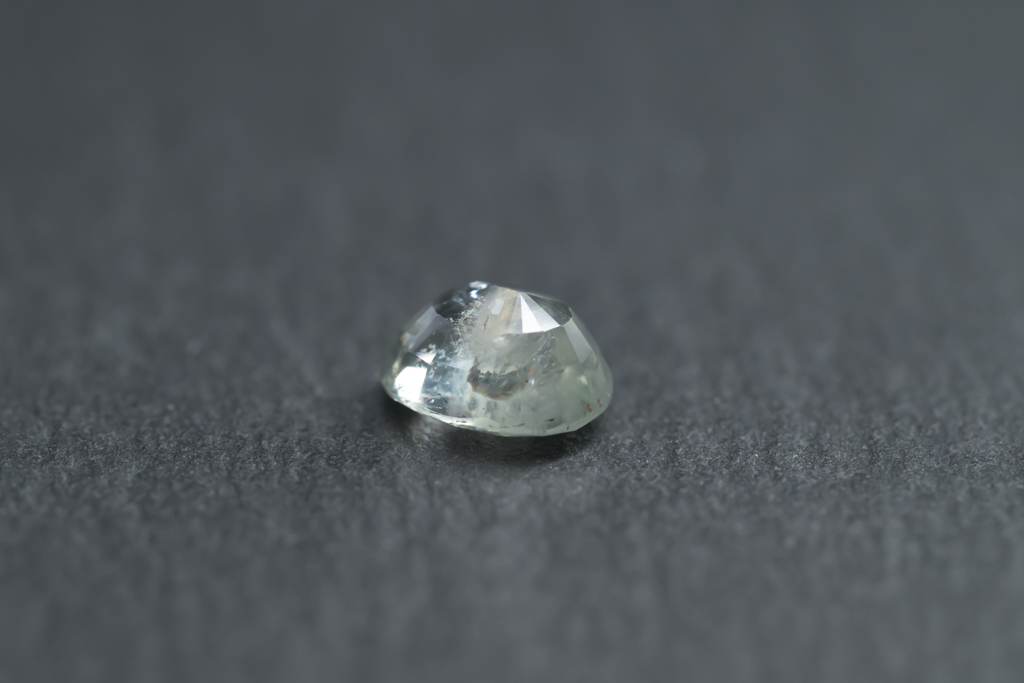 光に溶け込むような淡いグレイッシュグリーンの石の中に閉じ込められたブルーが角度によってほんのりと混ざる 繊細なニュアンスカラーが魅力的なスリランカ産のサファイアです。