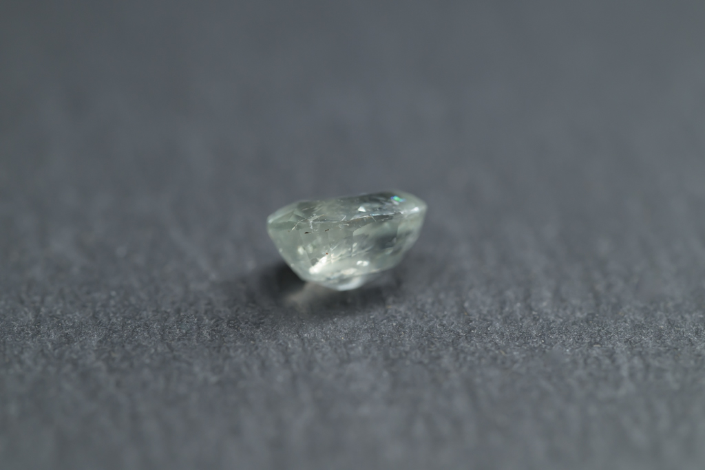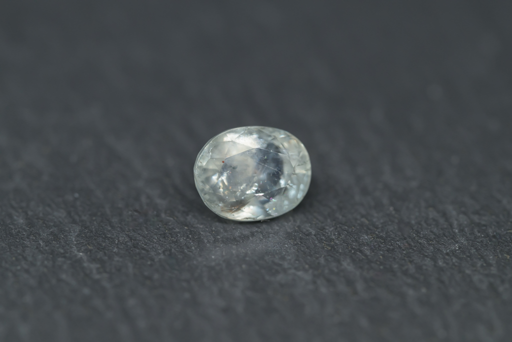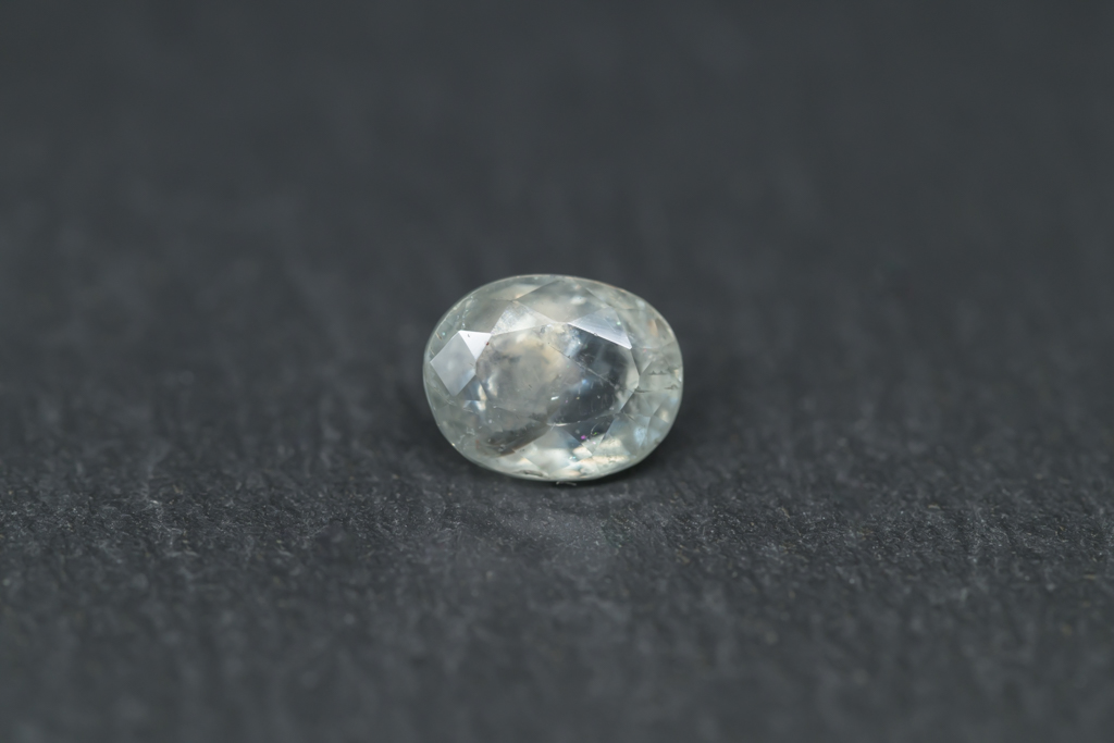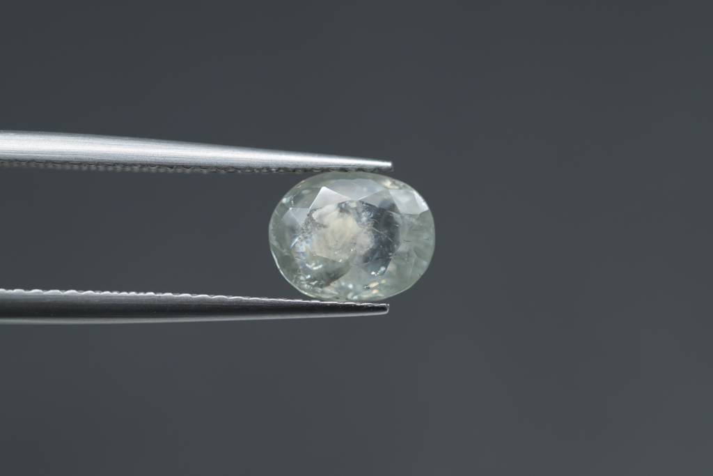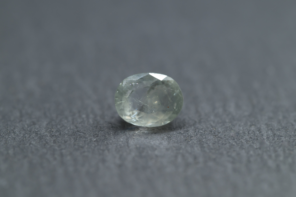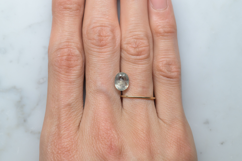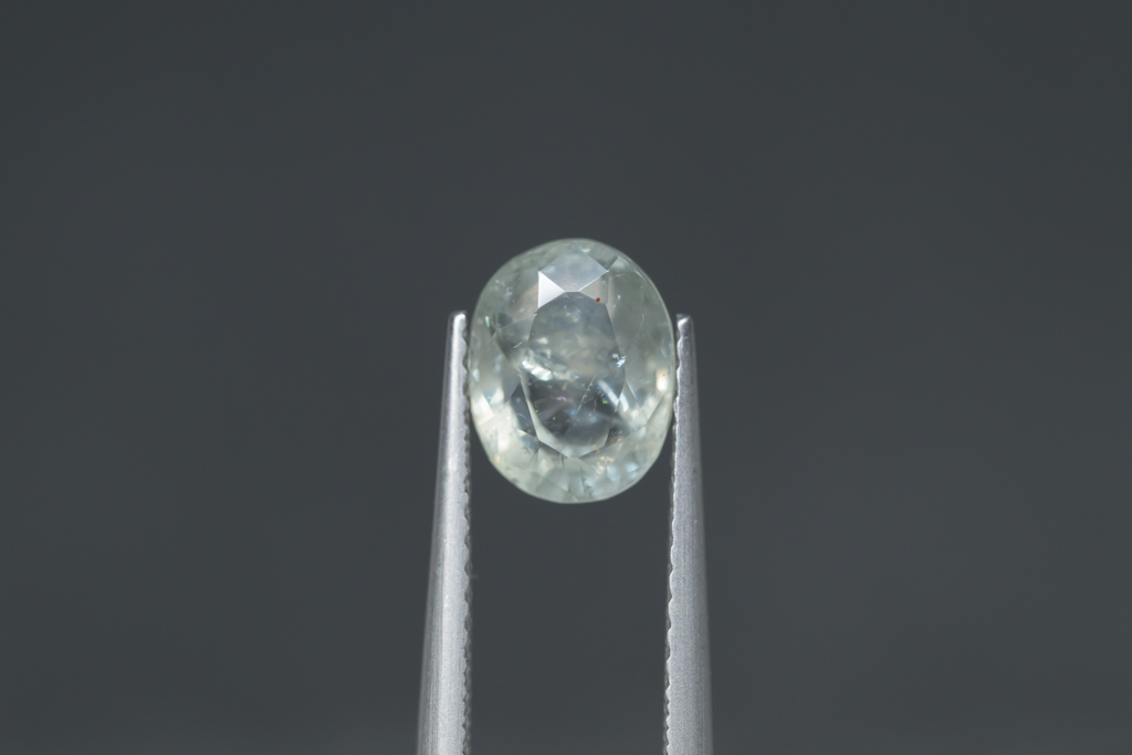 光に溶け込むような淡いグレイッシュグリーンの石の中に閉じ込められたブルーが角度によってほんのりと混ざる 繊細なニュアンスカラーが魅力的なスリランカ産のサファイアです。
