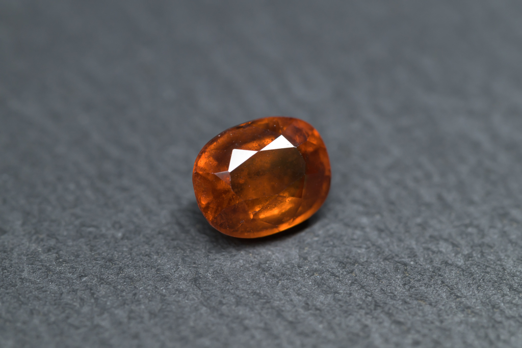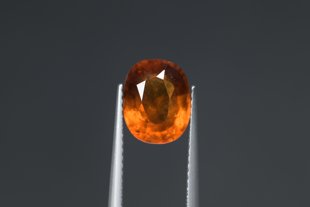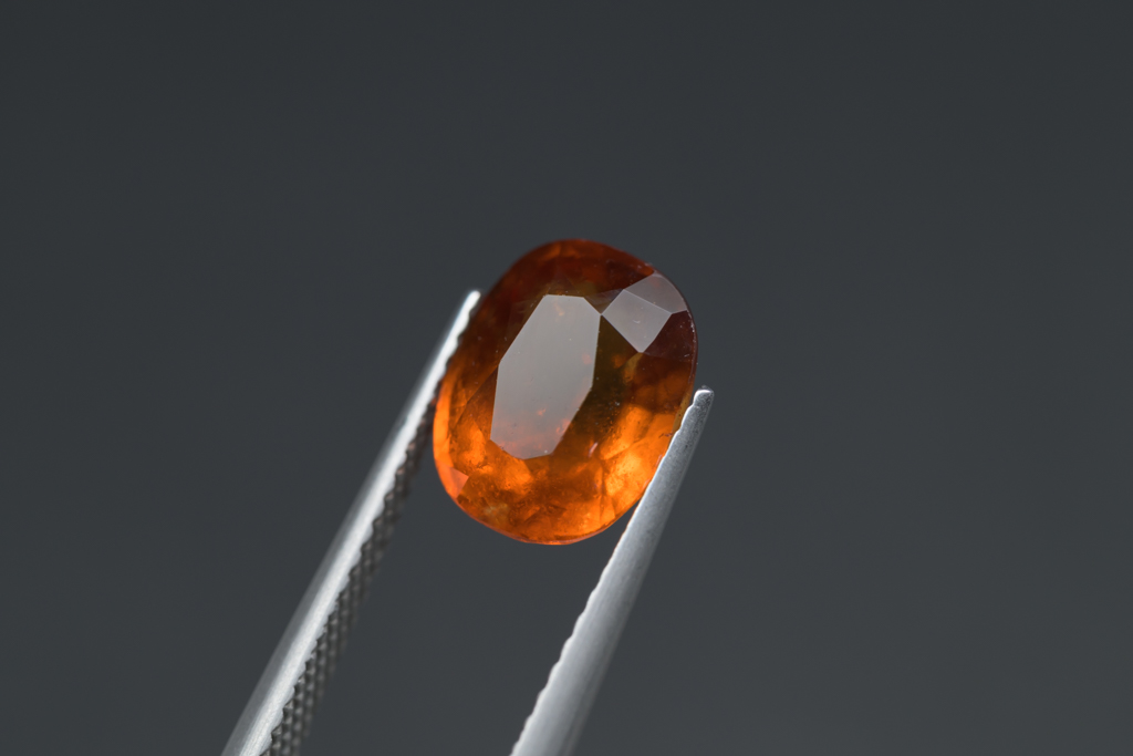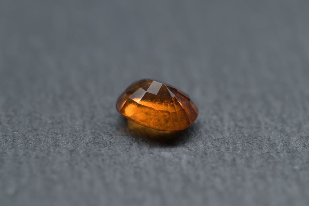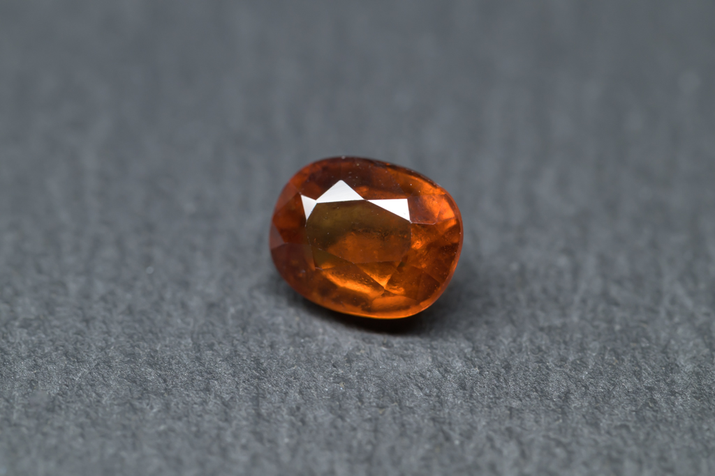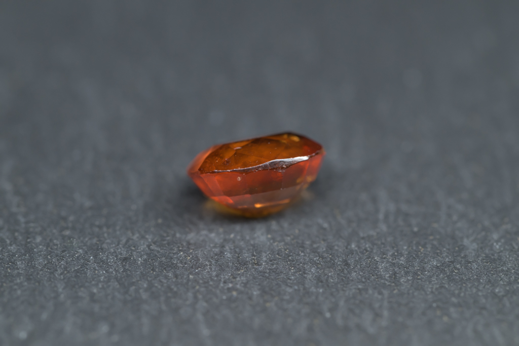 ふんわりと赤みを帯びたオレンジブラウンから鮮やかなオレンジの光がキラリと覗くスリランカ産のヘソナイトガーネットです。