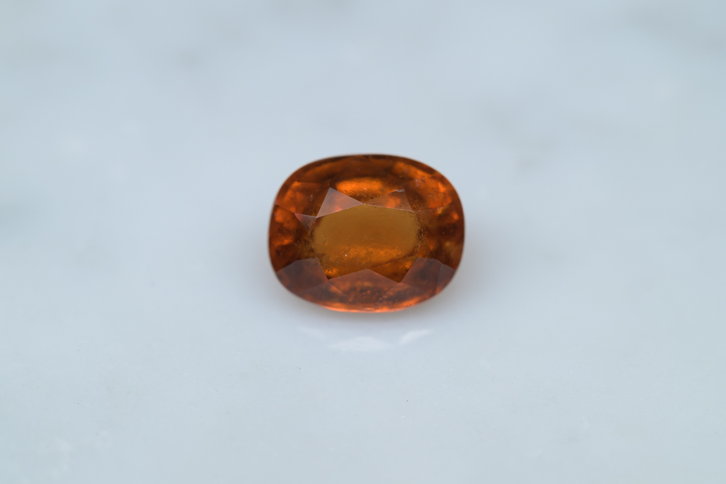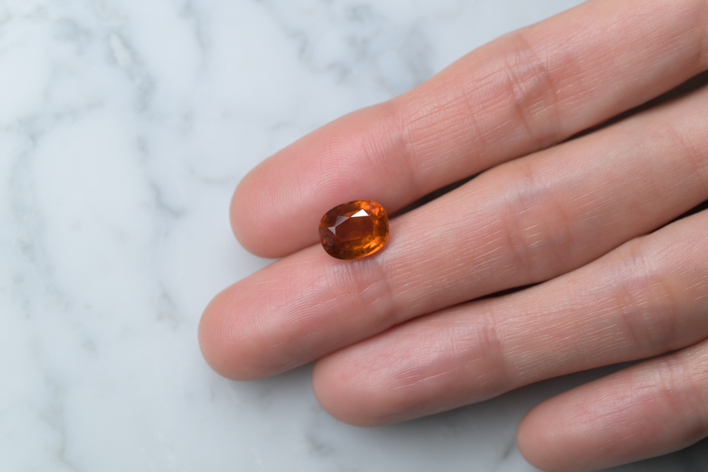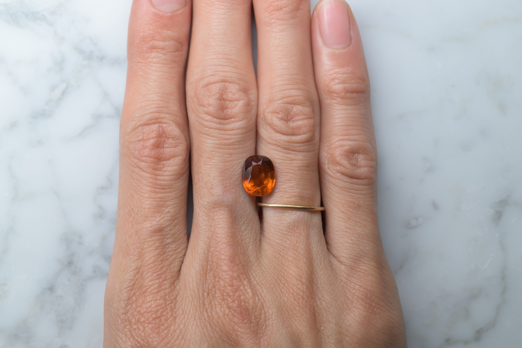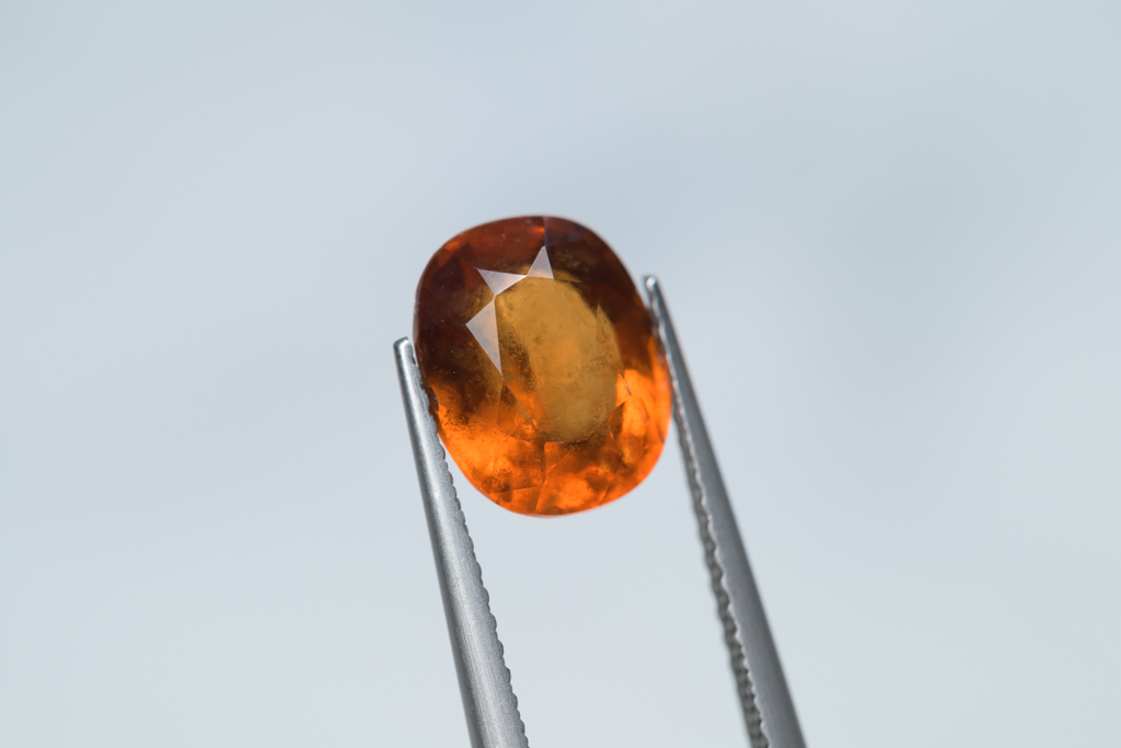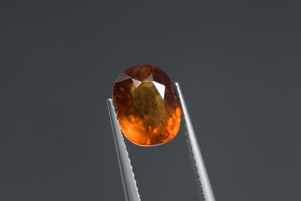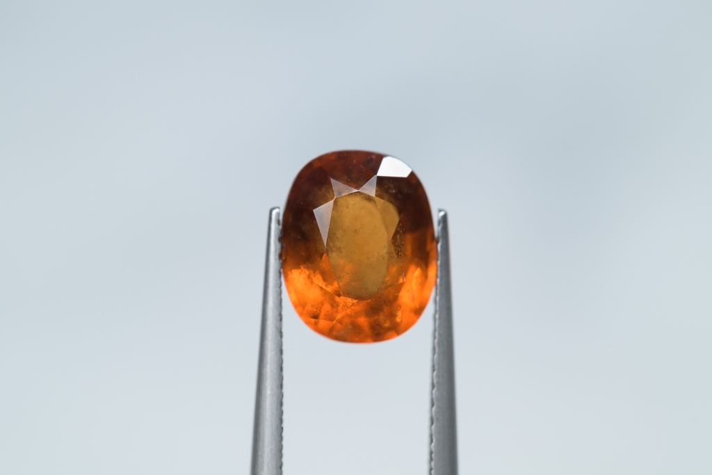 ふんわりと赤みを帯びたオレンジブラウンから鮮やかなオレンジの光がキラリと覗くスリランカ産のヘソナイトガーネットです。
